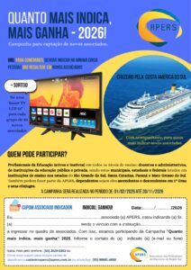 A Diretoria Executiva da APERS – Associação dos Profissionais da Educação da Região Sul, lança mais uma vez a campanha “Quanto mais indica, mais ganha”, que tem por objetivo, conquistar e engajar novos associados. No final da campanha ganhará quem mais indicou novos associados (as), em caso de empate será feito um sorteio.